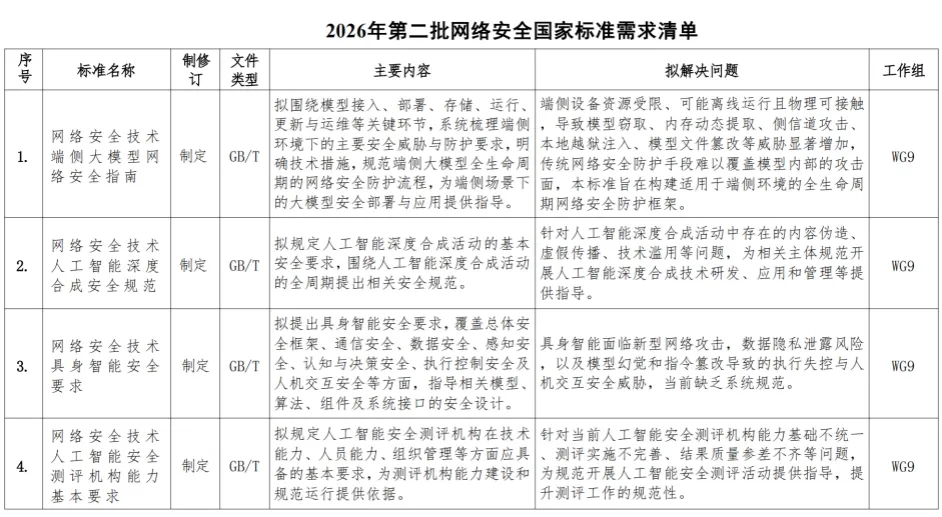 为落实市场监管总局、中央网信办、工业和信息化部、国家数据局等四部门联合印发的《加快推动人工智能百项国家标准建设专项行动计划》,全国网络安全标准化技术委员会秘书处研究形成了2026年度第二批网络安全国家标准需求清单。