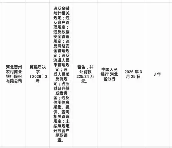 中国人民银行河北省分行行政处罚决定信息公示表显示:河北晋州农村商业银行股份有限公司因:违反金融统计相关规定,违反账户管理规定,违反数据安全管理规定,违反网络安全管理规定,违反流通人民币管理规定,违反人民币反假规定,占压财政存款或者资金,违反信用信息采集、提供、查询相关管理规定,未按照规定开展客户尽职调查。