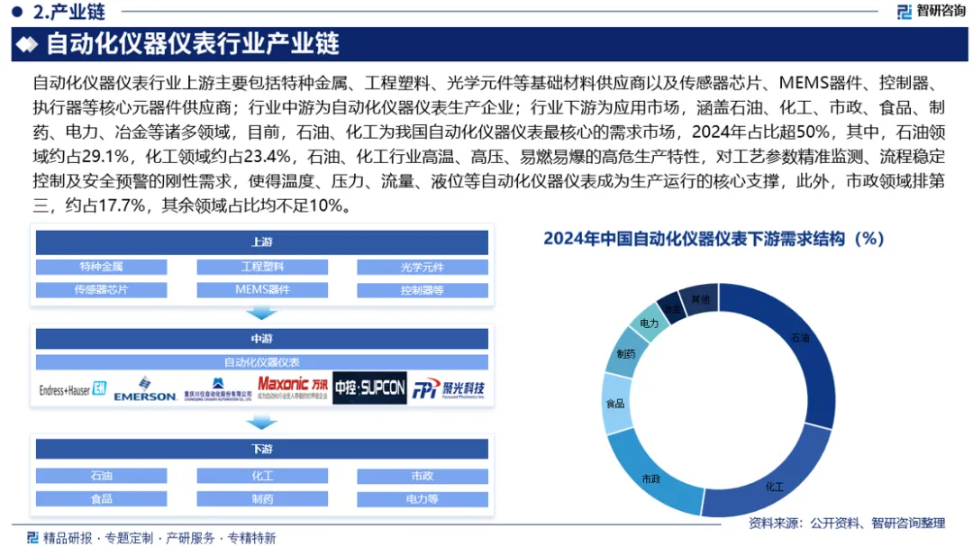 产业链核心节点:自动化仪器仪表行业上游主要包括特种金属、工程塑料、光学元件等基础材料供应商以及传感器芯片、MEMS器件、控制器、执行器等核心元器件供应商;行业中游为自动化仪器仪表生产企业;行业下游为应用市场,涵盖石油、化工、市政、食品、制药、电力、冶金等诸多领域。