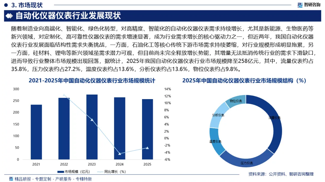 自动化仪器仪表是指在工业生产、科学研究、民生保障等领域中,能够自动完成信息检测、信号转换、数据处理、逻辑判断、控制指令输出等功能的设备或系统的总称。随着制造业向高端化、智能化、绿色化转型,对高精度、智能化的自动化仪器仪表需求持续增长,尤其是新能源、生物医药等新兴领域,对定制化、高可靠性仪器仪表的需求增速显著,成为行业需求增长的核心驱动力之一,但近两年,我国自动化仪器仪表行业发展面临结构性需求失衡挑战,一方面,石油化工等核心传统下游市场需求持续萎缩,对行业规模形成明显拖累,另一方面,硅材料、锂电等新兴领域虽需求潜力可观,但目前尚未完全释放增长势能,其增量无法抵消传统行业的需求下滑缺口,进而导致行业整体市场规模出现回落,据统计,2025年我国自动化仪器仪表行业市场规模降至258亿元,其中,流量仪表约占35.8%,压力仪表约占27.2%,温度仪表约占13.6%,分析仪表约占13.6%,物位仪表约占9.8%。