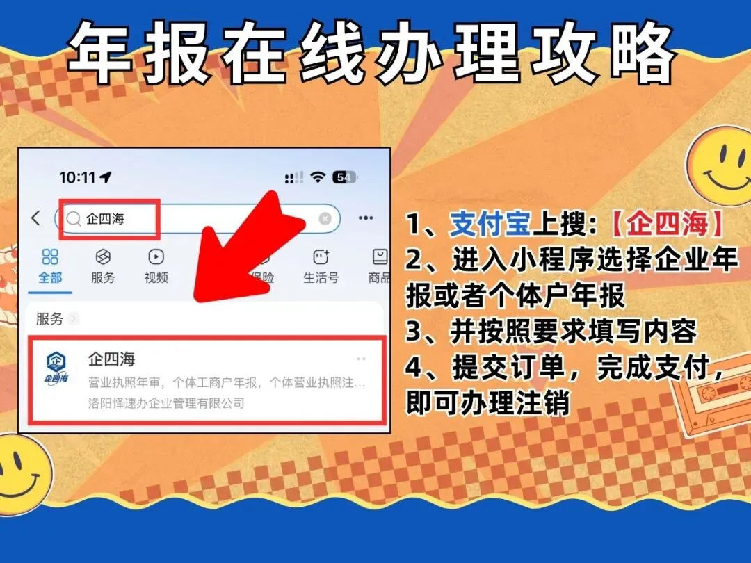 打开支付宝,在搜索栏输入“企四海”,找到小程序并进入,首页会清晰显示“年报”服务入口,根据自身执照类型选择对应选项。