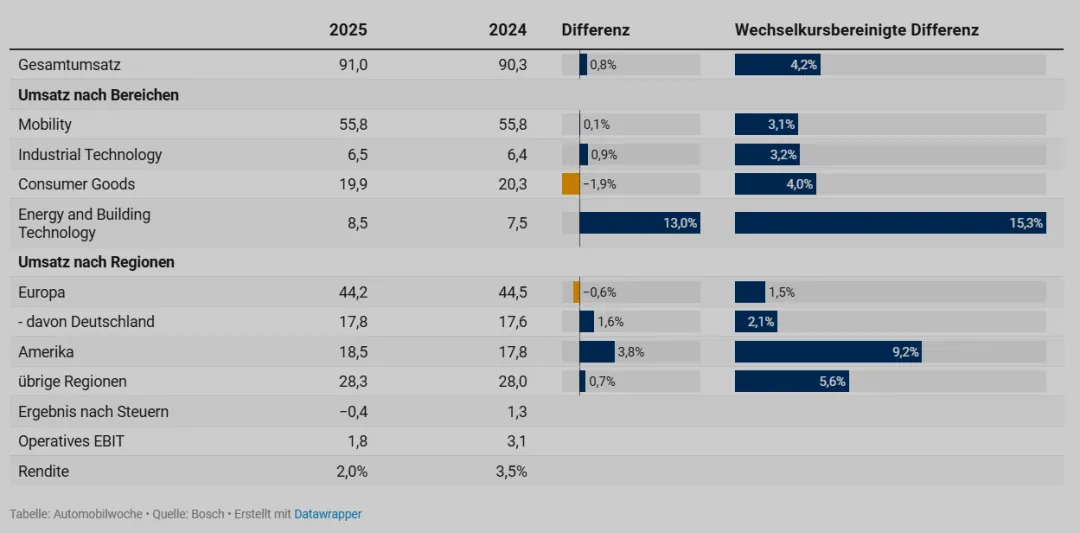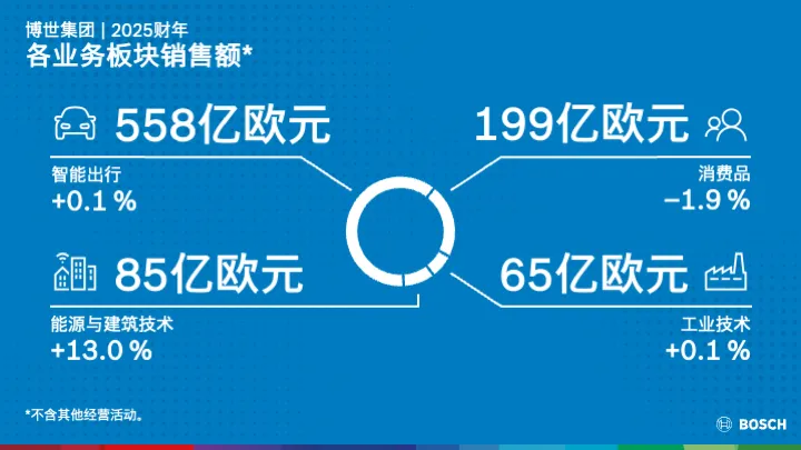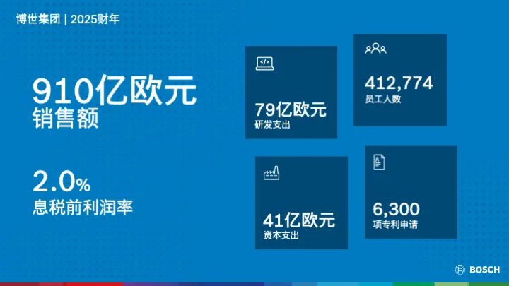 2025财年博世集团销售额910亿欧元,息税前利润率2.0%,自由现金流约3亿欧元。继2025年业绩不佳之后,今年的盈利能力有望提升。裁员规模小于预期。