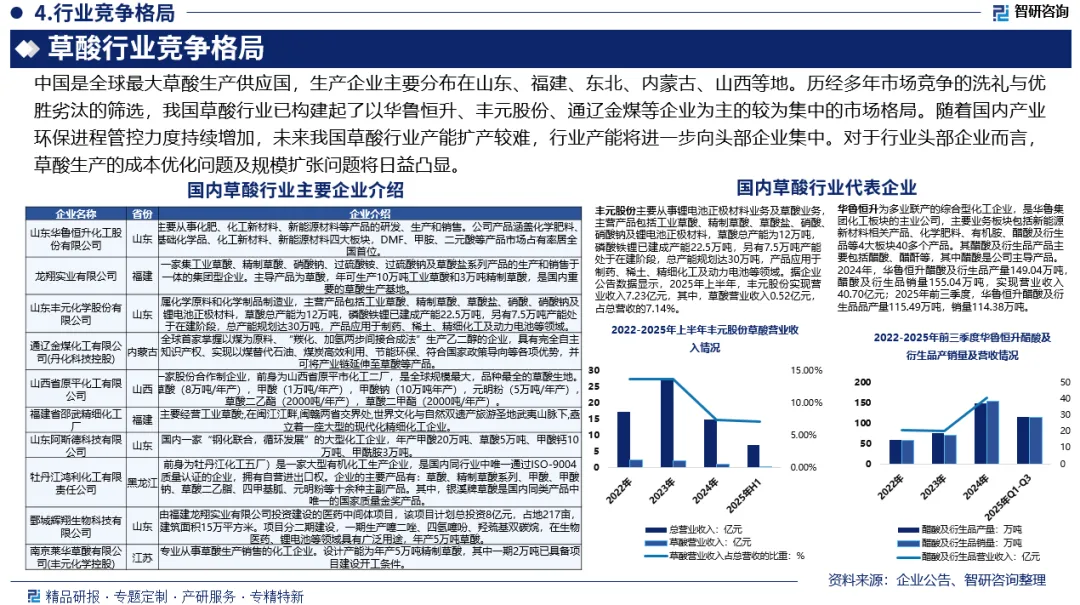 竞争情况:中国是全球最大草酸生产供应国,且企业主要分布在山东、福建、东北、内蒙古、山西等地。历经多年市场竞争的洗礼与优胜劣汰的筛选,我国草酸行业已构建起了以华鲁恒升、丰元股份、通辽金煤等企业为主的较为集中的市场格局。随着国内产业环保进程管控力度持续增加,未来我国草酸行业产能将进一步向头部企业集中。