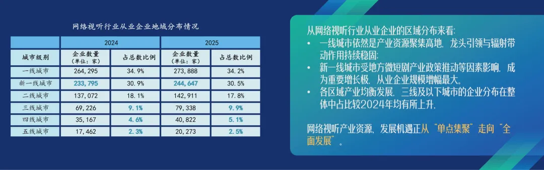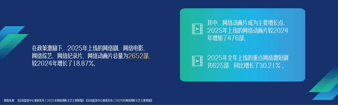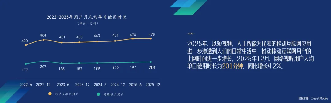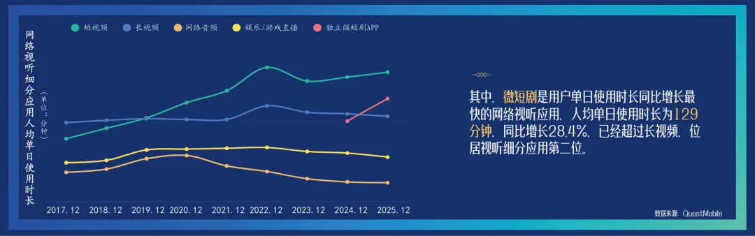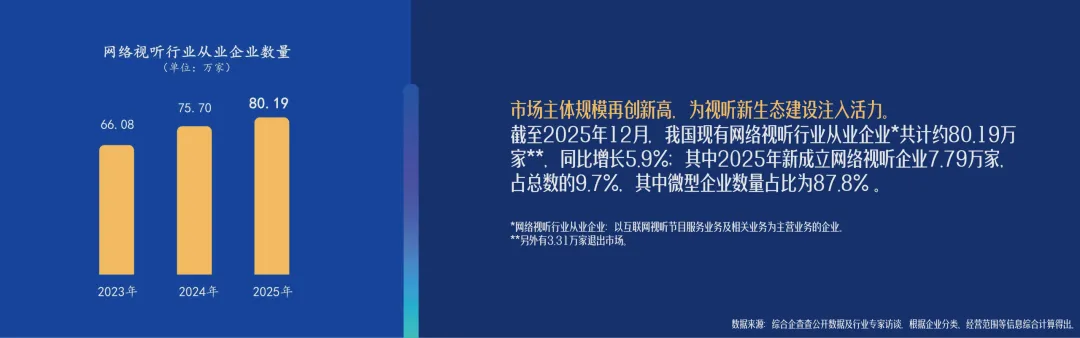 2025 年我国网络视听用户达 10.99 亿,稳居互联网应用首位,短视频是唯一用户规模与使用率双增长的细分应用;行业市场规模 1.29 万亿元,从业企业超80 万家;微短剧成为增长核心引擎,使用时长反超长视频、带动新一线产业崛起;用户单日使用时长201 分钟,近六成用户被视听内容种草消费;AI 生成视音频超 20 亿条,中国视听应用出海数量大幅提升,行业呈现用户稳增、市场扩容、内容精品化、技术赋能、全域发展、消费驱动、全球拓展的强劲态势。直接戳“阅读原文”下载