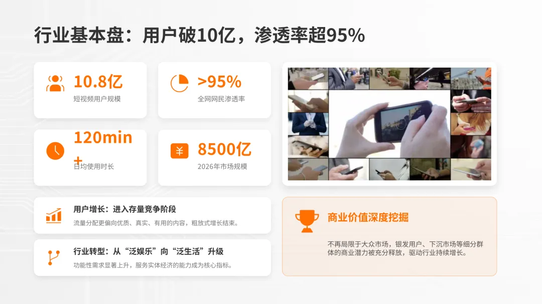 本报告基于2026年最新行业数据,全面分析中国短视频行业的发展阶段、现状特征及全球发展趋势 数据来源:CNNIC、QuestMobile、易观千帆、北京研精毕智等机构发布的2025-2026年行业报告。
