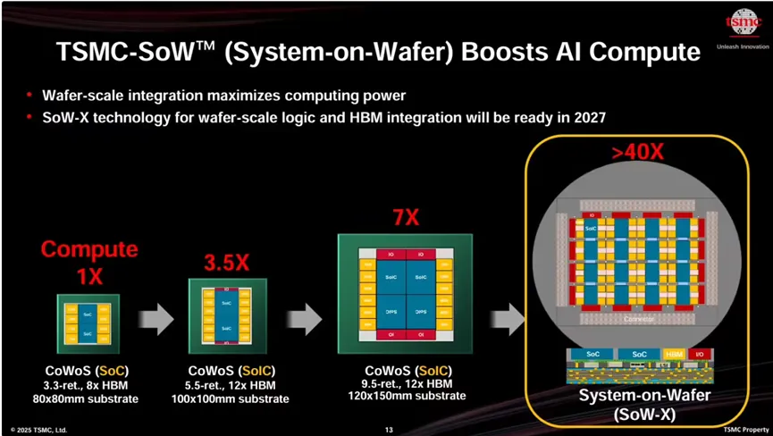 2025年提出的SoW-X技术(System-on-Wafer-X)代表了空间维度的终极扩展。该技术在单个晶圆上集成16个全光罩尺寸ASIC、80个HBM4模块以及2800个224Gb/s长距离SerDes通道,通过晶圆级液冷实现整片晶圆的统一热管理。