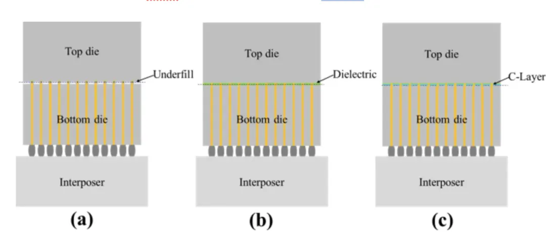图4:(a)微凸点、(b)标准SoIC和(c)SoIC-CS键合方案之间的结构差异,显示C层集成如何优化热传导路径。