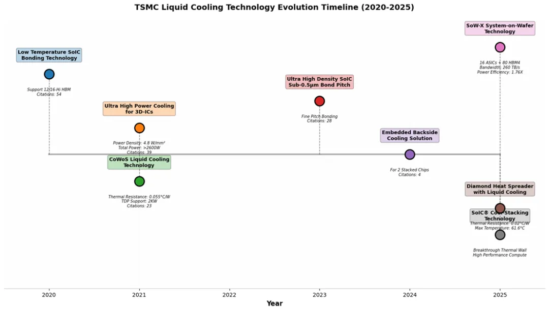 2020年发表的学术论文奠定了低温SoIC键合工艺基础(System on Integrated Chips),该技术支持12至16层高带宽存储器堆叠,为后续液冷技术提供了封装结构基础。其低温键合特性确保微通道与芯片连接的可靠性,该研究在学术界获得54次引用,成为该领域奠基之作。