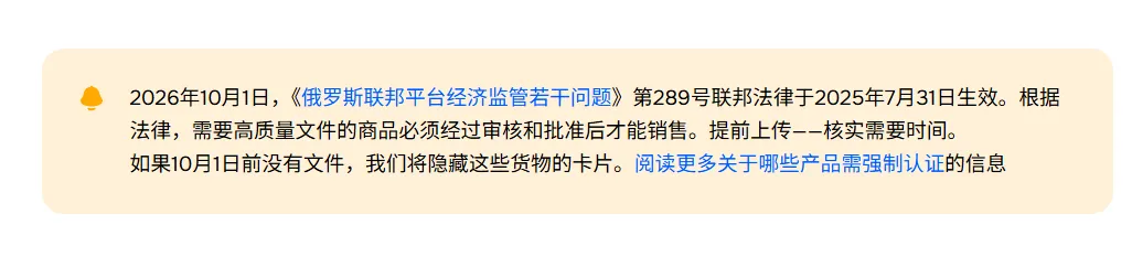 2026 年 10 月 1 日,《俄罗斯联邦平台经济监管若干问题》第 289 号联邦法律正式生效(2025 年 7 月 31 日经普京总统签署),彻底终结 “先上架、后补证” 时代。 官方要求:需提供质量文件的商品必须通过审核批准后方可销售,未提供合规文件的产品将被强制隐藏商品卡片,无法展示销售。