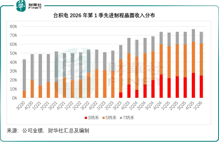按制程来看,3纳米技术贡献了25%的晶圆收入,而5纳米和7纳米制程的晶圆收入占比分别为36%和13%,整体而言,先进制程(7纳米及以下)占了其晶圆收入的74%,而上季的这一占比为77%。