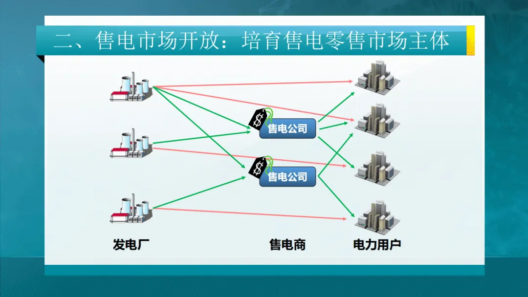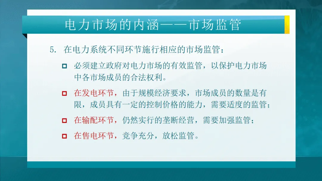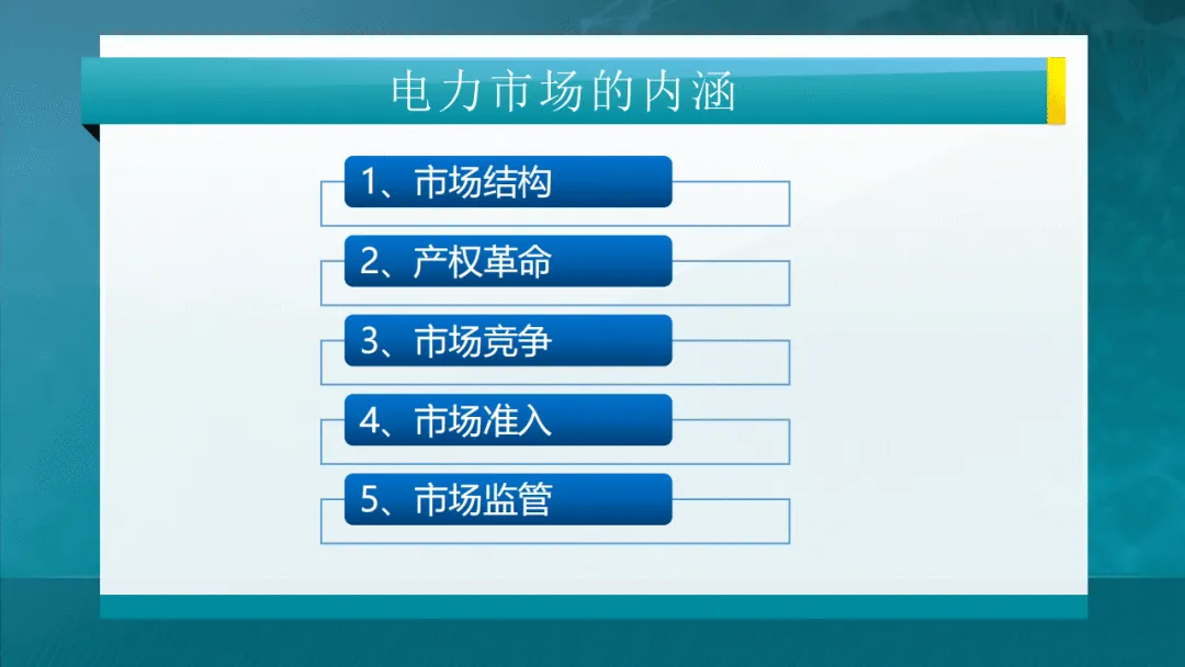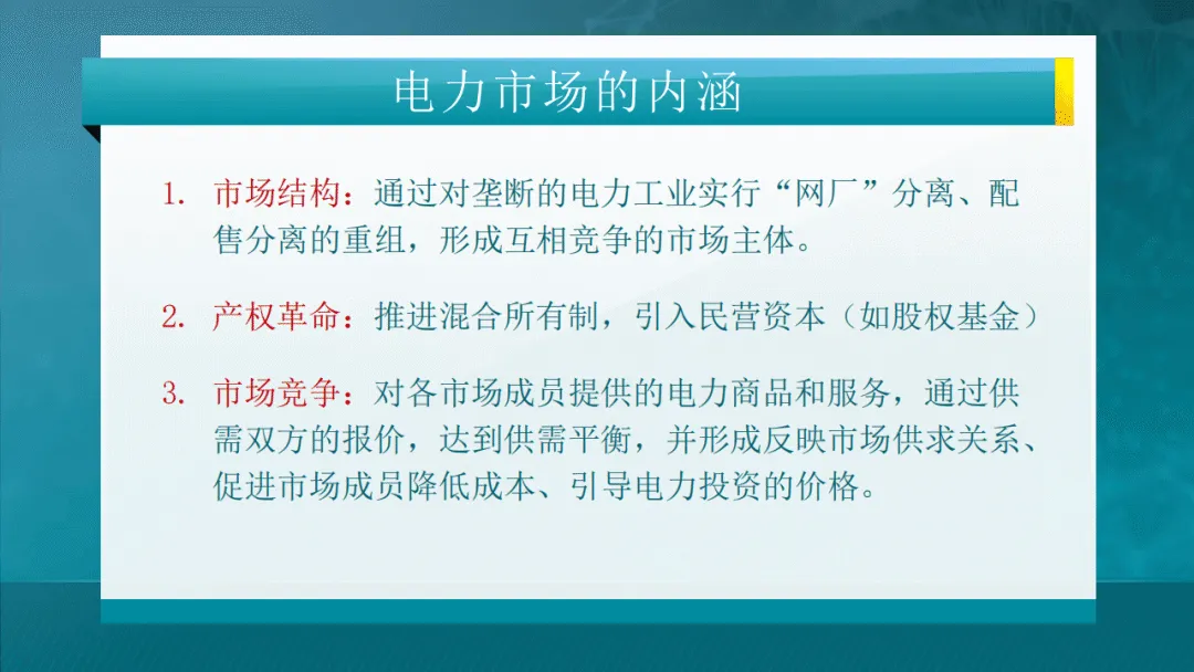 电力市场的本质是还原电能商品属性,通过网厂分离、配售分离、混合所有制等产权与体制改革,搭建竞争平台,以价格信号引导供需平衡、优化资源配置。其内涵覆盖市场结构、产权、竞争、准入与监管五大维度,发电环节适度监管、输配环节强化监管、售电环节放松监管,形成差异化监管体系。