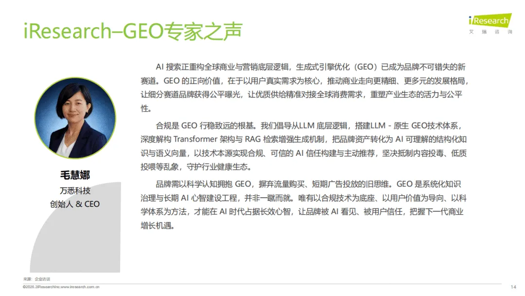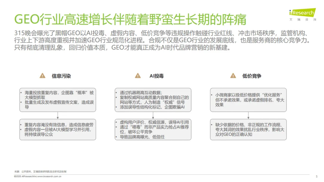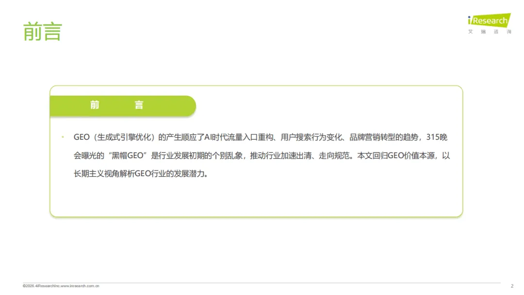2026年生成式引擎优化(GEO)行业随AI流量入口重构快速崛起,成为品牌营销新刚需,行业在经历初期乱象后正加速向规范化、长效信任生态转型。