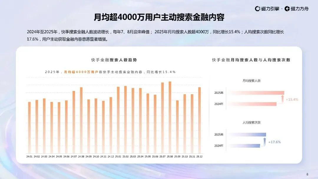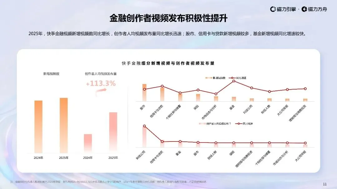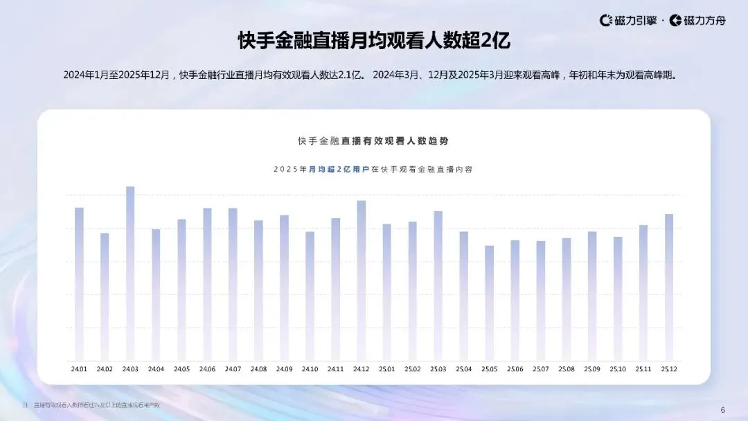 2025年上半年,快手金融视频收藏数、转发数同比增长显著,增速分别为19.2%165.2%;2025年全年,人均视频播放量与互动次数在3月迎来双高峰人均播放量下半年呈波动回升趋势。