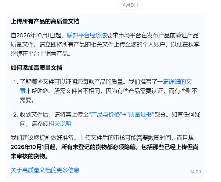 2026 年 10 月 1 日,《俄罗斯联邦平台经济监管若干问题》第 289 号联邦法律正式生效(2025 年 7 月 31 日经普京总统签署),彻底终结 “先上架、后补证” 时代。       官方要求:需提供质量文件的商品必须通过审核批准后方可销售,未提供合规文件的产品将被强制隐藏商品卡片,无法展示销售。