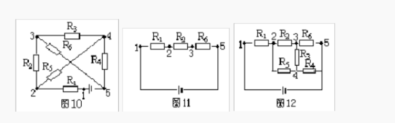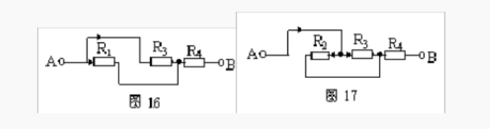 仍以图13为例,设电流由A端流入,B端流出,先撤去R2,由图16可知R1、R3有电流通过。再撤去电阻R1,由图17可知R2、R3仍有电流通过。同理撤去电阻R3时,R1、R2也有电流通过由并联电路的特点可知,R1、R2和R3并联,再与R4串联。