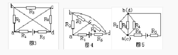 再把连接a、C节点的导线缩成一点,把连接b、d节点的导线也缩成一点,并把R5连到节点d的导线伸长线上(图5)。由此可看出R2、R3与R4并联,再与R1和R5串联,接到电源上。