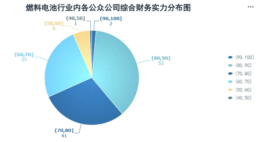 燃料电池行业所有公众公司综合财务实力统计均值为76.01, 极差值为46.21,标准差10.15。