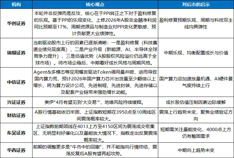 多家机构对当前市场格局给出积极研判,共识是:PPI转正驱动盈利修复,A股中期向好逻辑未变,科技成长仍是核心方向: