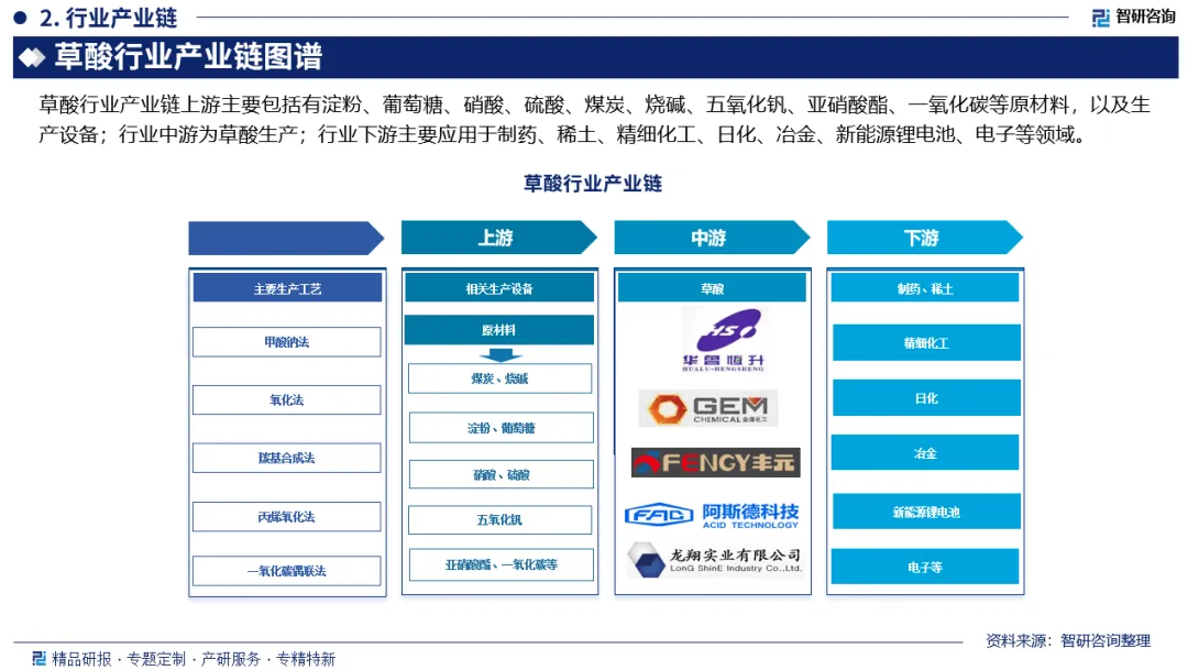产业链核心节点:草酸行业产业链上游主要包括有淀粉、葡萄糖、硝酸、硫酸、煤炭、烧碱、五氧化钒、亚硝酸酯、一氧化碳等原材料,以及生产设备;行业中游为草酸生产;行业下游主要应用于制药、稀土、精细化工、日化、冶金、新能源锂电池、电子等领域。