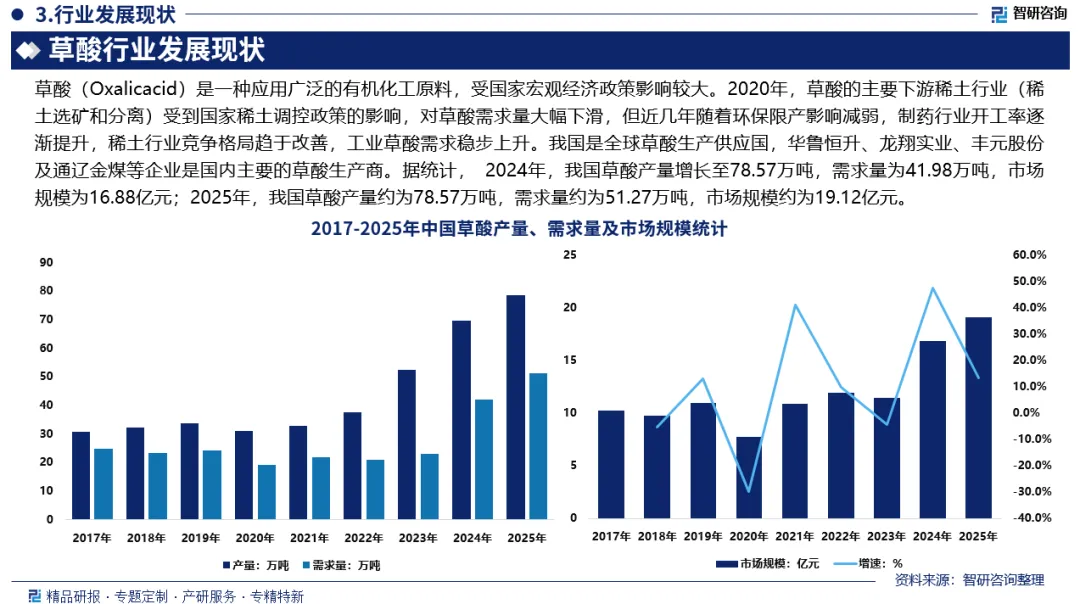 草酸(Oxalicacid)是一种应用广泛的有机化工原料,受国家宏观经济政策影响较大。2020年,草酸的主要下游稀土行业(稀土选矿和分离)受到国家稀土调控政策的影响,对草酸需求量大幅下滑,但近几年随着环保限产影响减弱,制药行业开工率逐渐提升,稀土行业竞争格局趋于改善,工业草酸需求稳步上升。我国是全球草酸生产供应国,华鲁恒升、龙翔实业、丰元股份及通辽金煤等企业是国内主要的草酸生产商。据统计,2024年,我国草酸产量增长至78.57万吨,需求量为41.98万吨,市场规模为16.88亿元;2025年,我国草酸产量约为78.57万吨,需求量约为51.27万吨,市场规模约为19.12亿元。