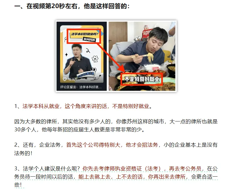 A2:我记得张雪峰说过,先去检法工作几年,再转行做律师,以此渡过做律师最艰难的实习期,这可能为弯道超车的方法。这个说法有一定的道理。理由有几点:①进入体制内的待遇比实习律师好,经济压力会比较小。②进入体制内好找对象,可以在体制内先解决婚恋问题。③体制内工作有助于养成良好的工作习惯。个人认为律师行业的培养模式有很大的问题,存在很多的不规范的工作习惯,而且绝大部分的律师是非常有懒惰或懒惰倾向。毕业后的首份工作在检、法,更容易培养起良好的工作习惯,这样基础打好后以后进入律师行业后不容易被带坏。④检、法有大量的案件历练自己。好的法官、检察官都是案子喂出来的,好的律师也是案子喂出来的,在检、法工作容易有大量的练手机会,而律师行业不一定,可能会忙到飞起,也有可能看你太难带放弃你导致你没什么事情做。