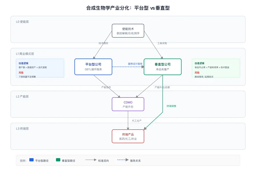 一个值得关注的信号是'平台型公司的垂直化试探':Ginkgo开始自建部分产能,蓝晶微生物从PHA平台延伸至材料制品。这种'从铲子到矿场'的边界模糊,暗示平台模式的纯服务费收入难以支撑高估值,必须向下游要利润。