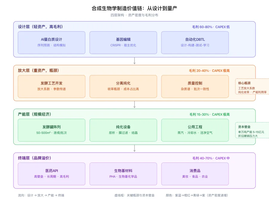 这意味着,合成生物学产业的价值分布呈现'微笑曲线'的变形:上游使能技术(基因合成、编辑工具)和下游终端品牌(消费品、医药)捕获较高毛利,但中游的制造环节——尤其是产能投资——构成了最重的资本壁垒。对于垂直型公司而言,自建产能是护城河,也是绞肉机;对于平台型公司而言,轻资产运营是估值故事,但也意味着对制造质量的失控风险。