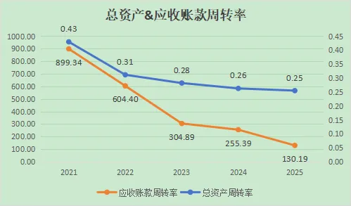 两项指标都在稳定的持续走低,尤其是应收账款周转率的下降幅度之大很明显的展示出企业放宽了销售政策或者说产品不再像以往那么畅销了,从开始的钱货两讫或者先钱后货到现在的先货后钱能明显感受到企业的发展遇到了困难或者营收增长的乏力。