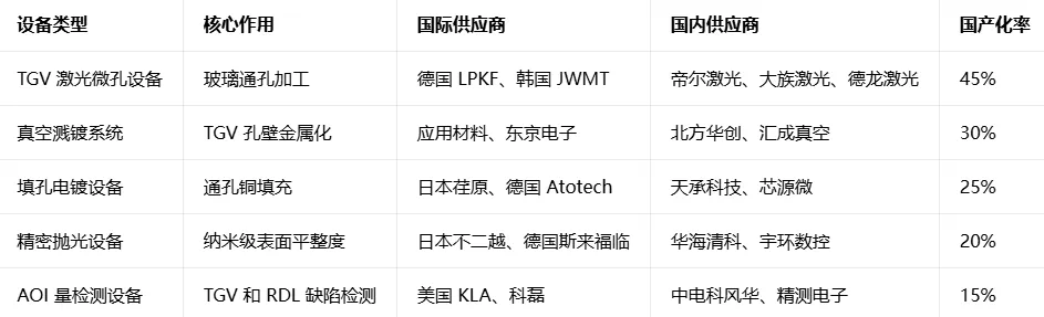 3.国产替代加速:国内企业在 TGV 全制程、激光设备、填孔电镀等关键环节已取得突破,国产化率将从 2025 年的 8% 快速提升至 2030 年的 50%