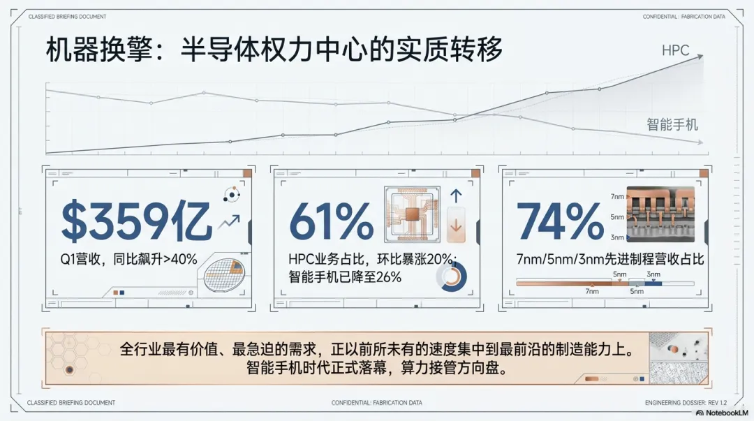 如果把台积电比作一座能源中枢,那么你现在看到的,不是某一类燃料卖得稍微好一点,而是整个社会的主引擎换了。过去那台驱动行业的机器,主要是手机;现在,接过方向盘的已经是AI和高性能计算。