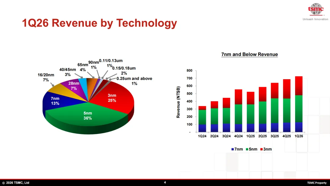 更关键的是,先进制程的收入贡献也已经到了一个非常夸张的程度。7纳米、5纳米和3纳米这些先进制程,合计包揽了74%的晶圆营收。这个比例说明的不是台积电“技术领先”这么简单,而是全行业最有价值、最急迫、最不能出错的需求,正在以前所未有的速度集中到最先进的制造能力上。