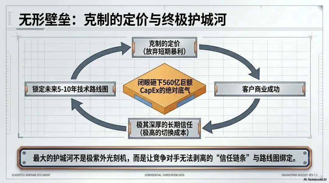 在半导体这个行业里,客户一旦选定底层架构、设计流程和制造伙伴,切换成本极高。你今天少赚一点,不去逼客户短期出血,换来的却是客户愿意把未来5年、10年的技术路线图和产能规划都交给你。