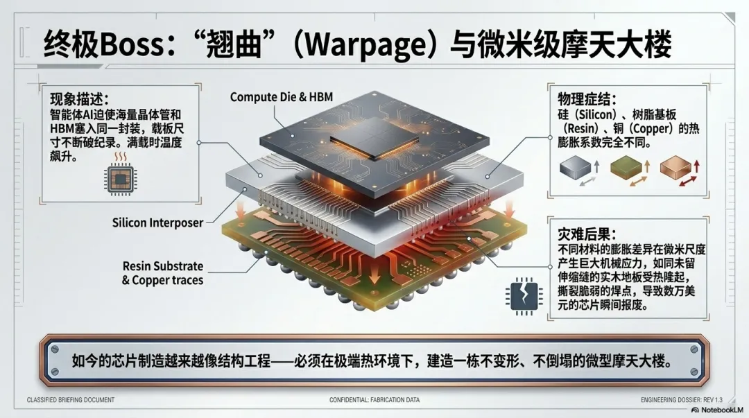 听起来像个小毛病,但它绝不是软件里写错一行代码、改一下bug就能修复的事情。翘曲是实打实的物理变形,严重时意味着整块昂贵芯片直接报废。