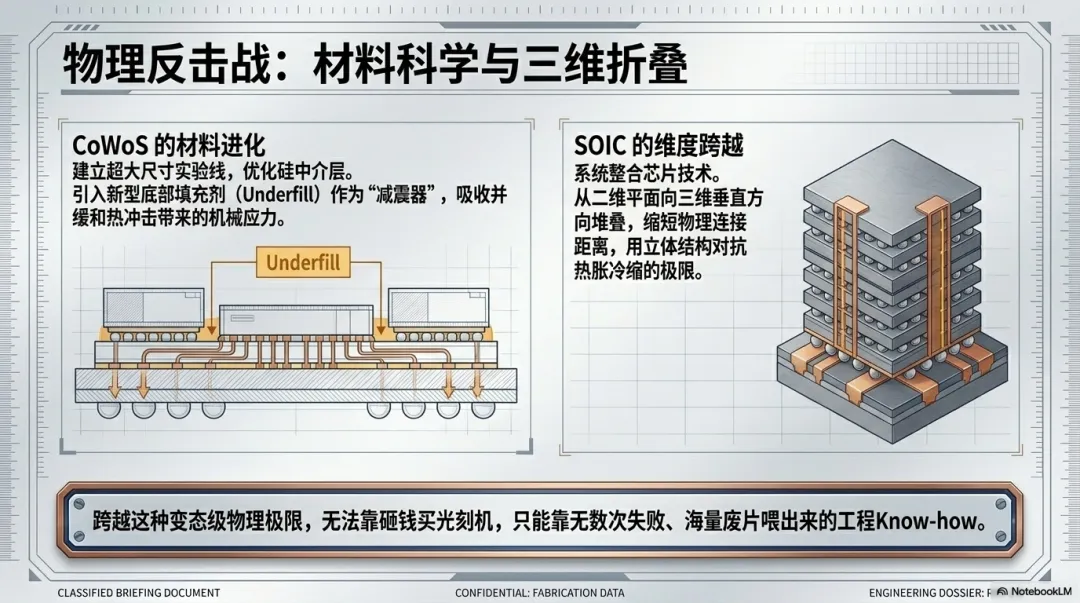 比如CoWoS技术,他们正在建立超大尺寸CoWoS实验线,不断优化硅中介层材料特性,改进底部填充剂,用来缓和和吸收机械应力。我们可以把底部填充剂理解成一种“减震器”,帮助整个系统在热冲击中不至于被内部应力撕裂。