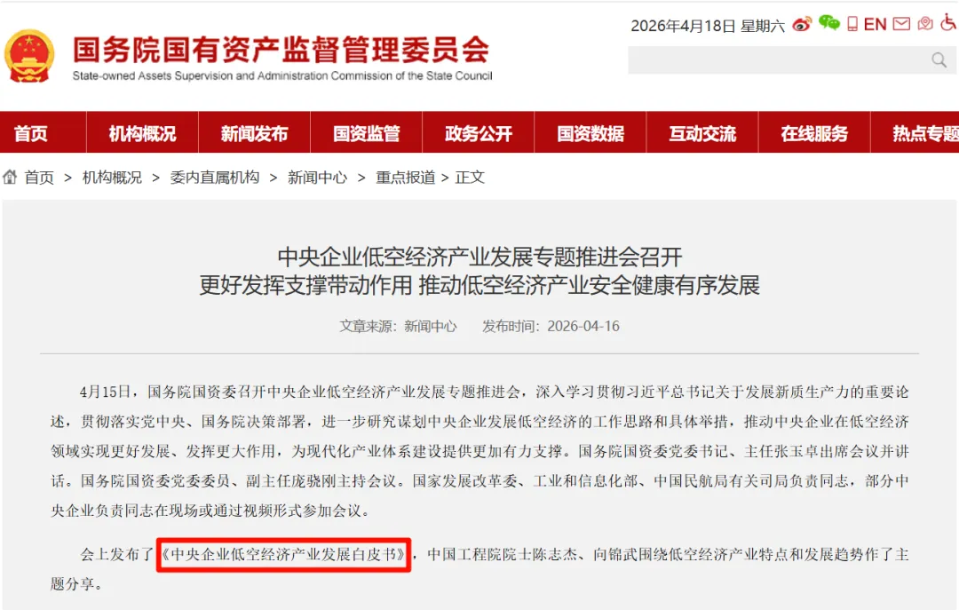 ▸ 人民日报|国资委发布《中央企业低空经济产业发展白皮书》(4月17日)