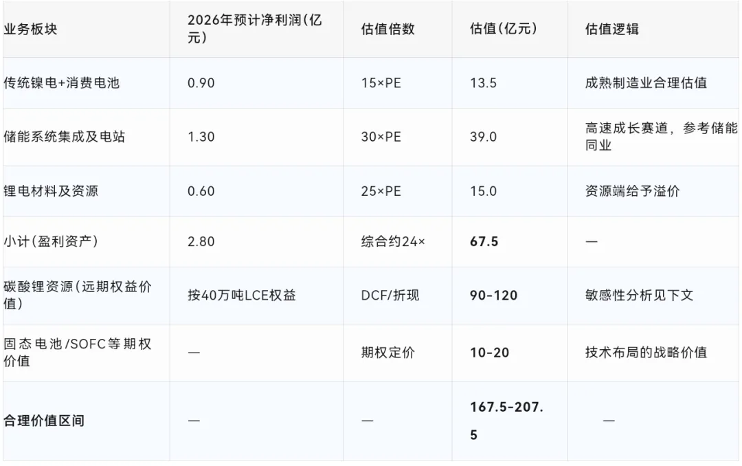 近期受供给端扰动影响,电池级碳酸锂中间价已回升至约17万元/吨。若中长期均价站稳12-15万元/吨,按2万吨产量、7万元/吨成本计算,碳酸锂业务年化净利润可达10-16亿元。即使给予保守的12-15倍PE,该板块市值贡献亦可达120-240亿元。