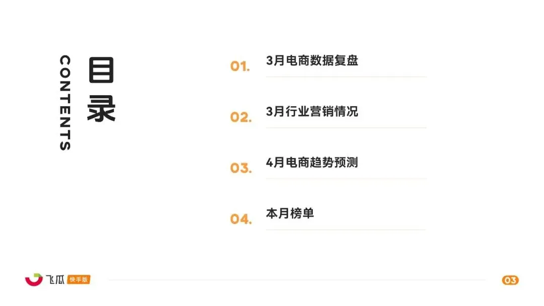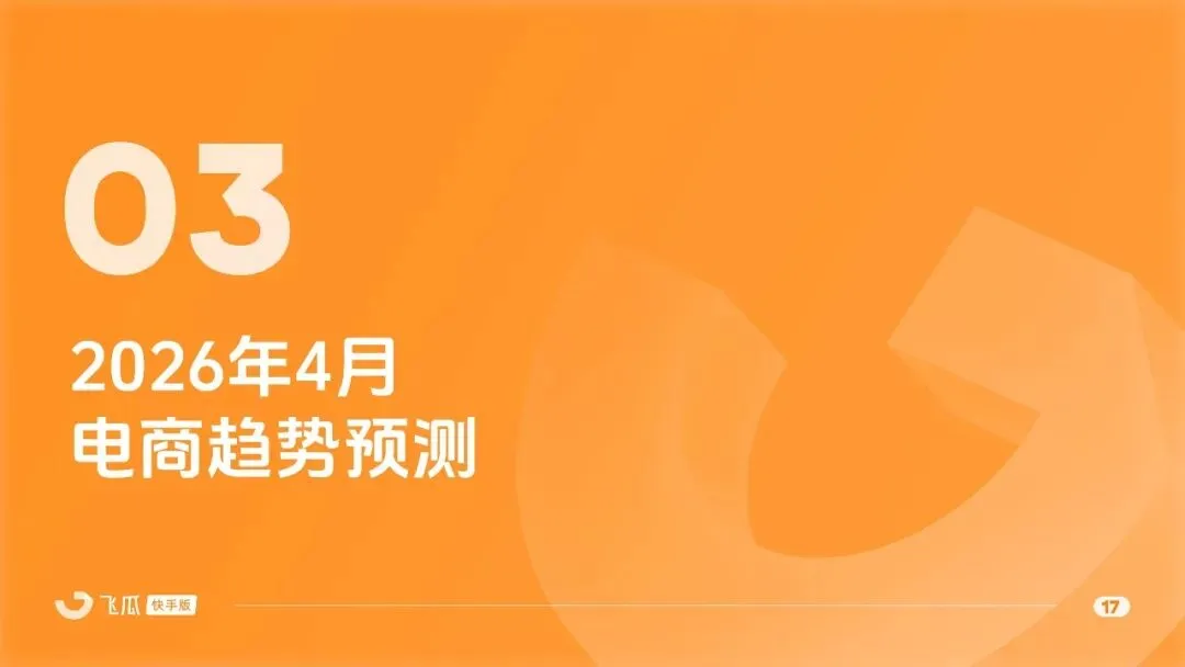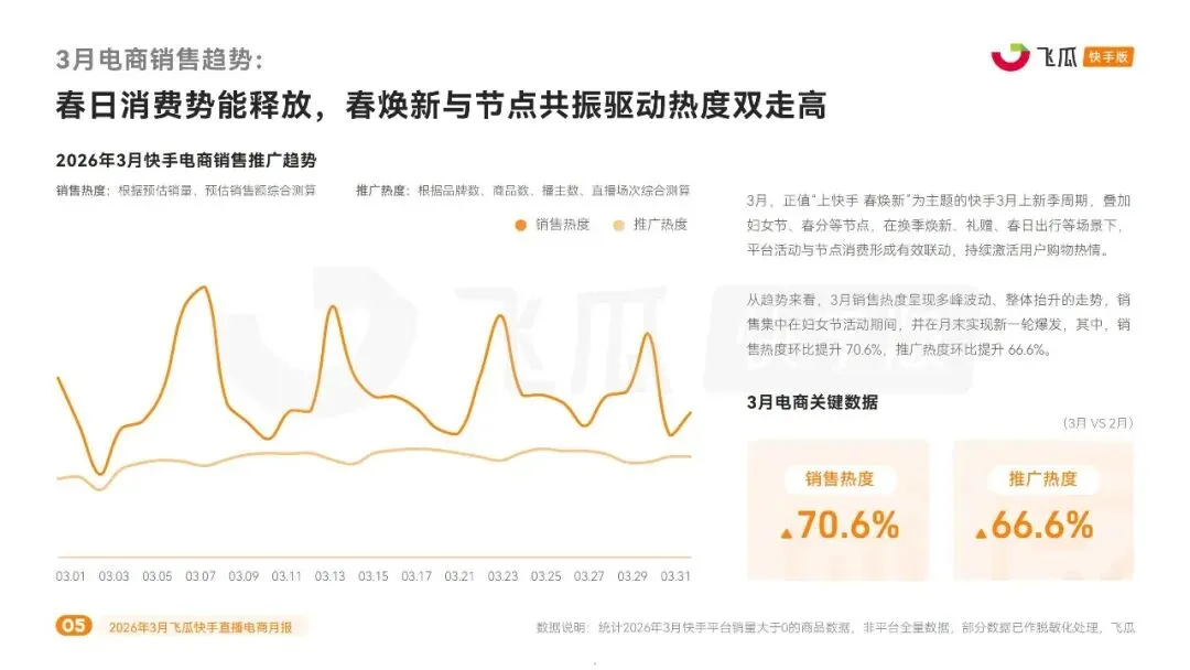 这份由飞瓜数据发布的 2026 年 3 月快手直播电商月报,围绕平台电商数据、行业营销、4 月趋势及品牌榜单展开,核心呈现春日消费爆发、细分品类崛起、场景化营销深化的特征,平台整体电商热度大幅攀升。