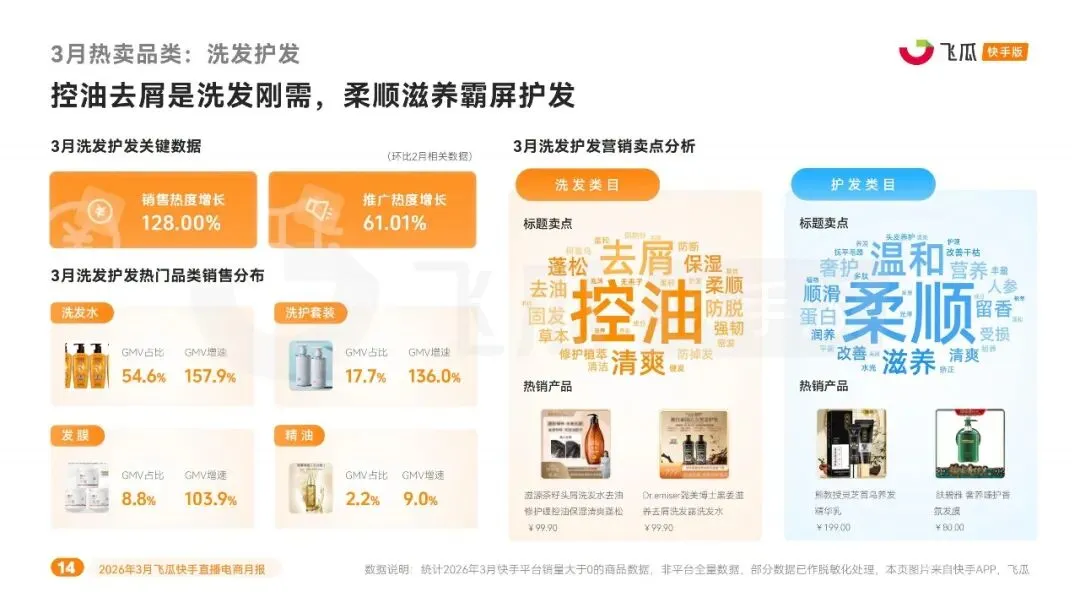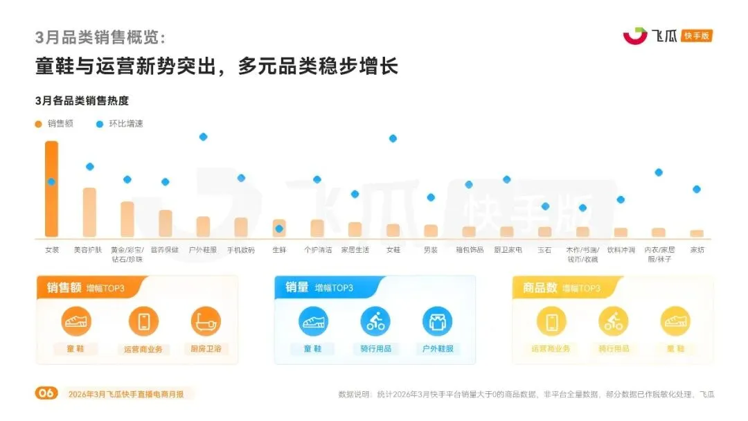 3 月快手借 “春焕新” 活动叠加妇女节、春分节点,消费势能全面释放。销售热度环比提升 70.6%,推广热度环比增长 66.6%,热度呈多峰波动走势,妇女节与月末形成两次销售高峰,换季焕新、礼赠、春日出行场景带动用户消费热情持续高涨。品类层面,童鞋、运营商业务、厨房卫浴位列销售额增幅前三,童鞋、骑行用品、户外鞋服领跑销量增速,多元品类实现稳步增长。