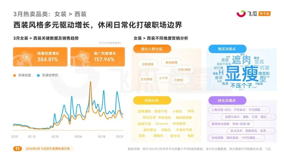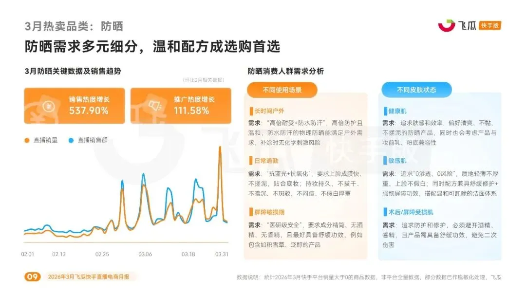 行业营销端,多个细分品类迎来爆发式增长。防晒品类表现最突出,销售热度环比暴涨 537.9%,推广热度增长 111.58%,消费需求按场景与肤质细分,高倍防护、温和配方、抗蓝光成核心卖点。女鞋单鞋、女装西装、户外服装、运动鞋服等服饰品类增速显著,女鞋单鞋聚焦通勤、约会、出行场景,皮鞋、乐福鞋 GMV 增速超 300%;女装西装销售热度增长 384.81%,休闲化、场景化穿搭成趋势;户外服装销售热度增长 301.8%,冲锋衣裤占据半壁江山;运动鞋服销售热度增长 227.8%,安踏、特步等国产品牌领跑。