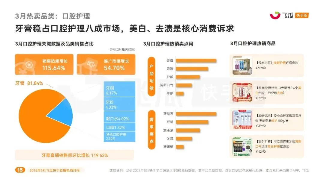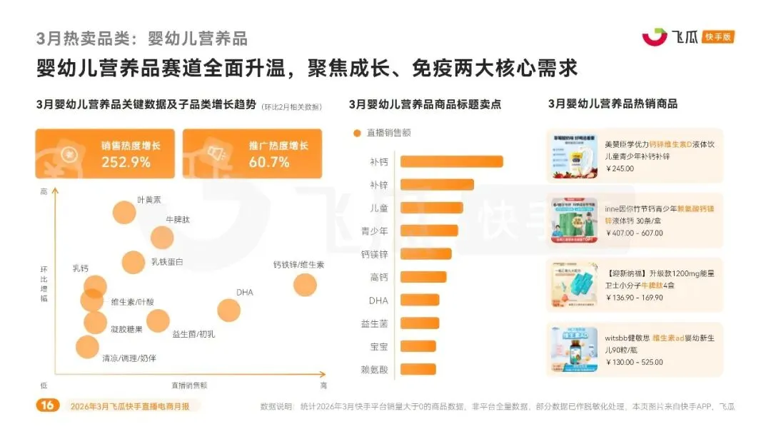此外,洗发护发、口腔护理、婴幼儿营养品等日用母婴品类热度走高。洗发护发热度增 128%,控油去屑、柔顺滋养为核心卖点;口腔护理热度增 115.64%,牙膏占比超八成,美白去渍是主流需求;婴幼儿营养品销售热度增长 252.9%,聚焦补钙、免疫、叶黄素等精细化需求。