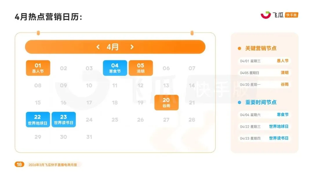 报告预测 4 月将依托清明、谷雨、世界地球日等节点,户外鞋服、生鲜、环保好物、春茶等品类持续热销,踏青、环保、趣味营销将成为核心方向。