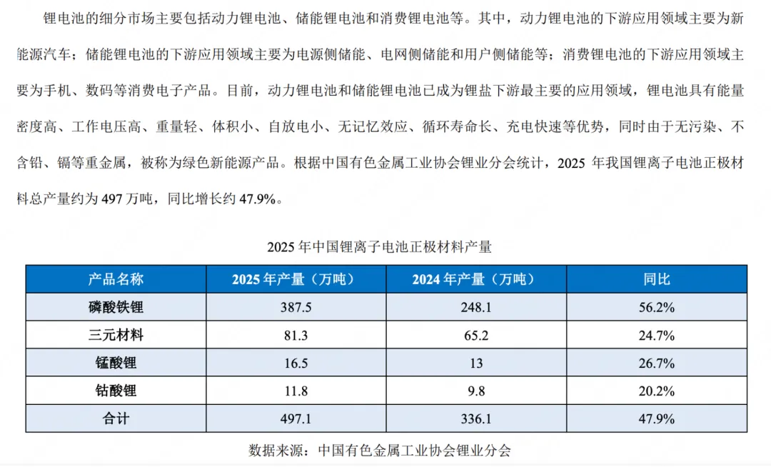 2025 年全球锂离子电池总体出货量 2,280.5GWh,同比增长 47.6%。出货量的大幅度超预期增长主要来自储能电池领域,尤其是中国之外的储能市场需求拉 中矿资源集团股份有限公司 2025 年年度报告全文 24 动,全球储能电池总出货量达到了 651.5GWh,同比增长幅度高达 76.2%。在新能源汽车动力电池领域,得益于中国市场 持续推进以旧换新,新能源汽车出口量翻倍增长等因素带动,全球动力电池出货量达到 1,495.2GWh,增长 42.2%。小型 电池领域,新消费领域如 AI、人形机器人、eVTOL 等开启产业化应用的早期阶段,为未来小型电池创造了较大的市场 空间,2025 年全球小型电池出货量 133.9GWh,同比增长 7.9%。