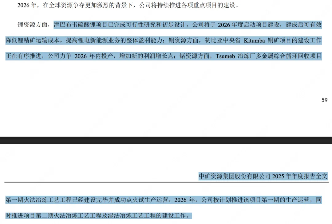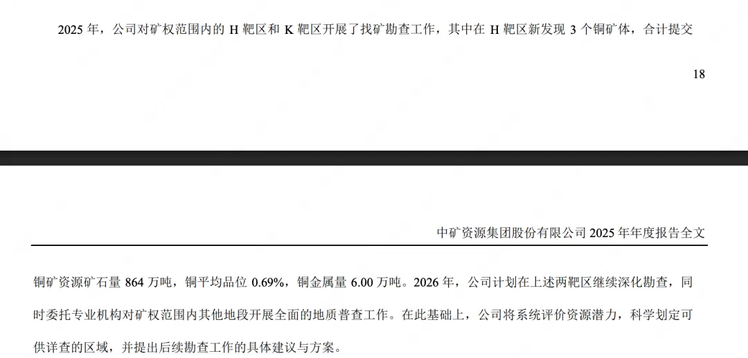 2024 至 2025 年,Bikita 矿区北部开展找矿勘查,探获新的伟晶岩体,经建模估算,按 Li2O 边界品位 0.2%统计,新 增锂资源矿石量 2,431.92 万吨,Li2O 平均品位 0.72%,新增 Li2O 金属量 17.42 万吨,折合碳酸锂当量(LCE)43.03 万 中矿资源集团股份有限公司 2025 年年度报告全文 17 吨。矿区累计探获矿石资源量 14,143.47 万吨,Li2O 平均品位 0.98%,Li2O 含量 139.03 万吨,折合 343.41 万吨碳酸锂当 量(LCE)。