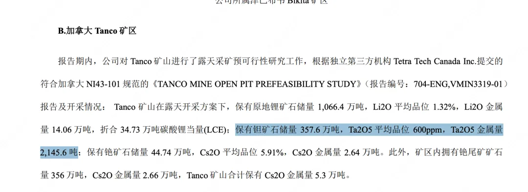 报告期内,公司对 Tanco 矿山进行了露天采矿预可行性研究工作,根据独立第三方机构 Tetra Tech Canada Inc.提交的 符合加拿大 NI43-101 规范的《TANCO MINE OPEN PIT PREFEASIBILITY STUDY》(报告编号:704-ENG,VMIN3319-01) 报告及开采情况: Tanco 矿山在露天开采方案下,保有原地锂矿石储量 1,066.4 万吨,Li2O 平均品位 1.32%,Li2O 金属 量 14.06 万吨,折合 34.73 万吨碳酸锂当量(LCE)。公司所属加拿大 Tanco 矿山现采用地下开采方式进行矿产资源开发作业,公司正积极推进 Tanco 矿山地下转露天开 采工作,以提升资源综合利用效率及集约化开发水平。