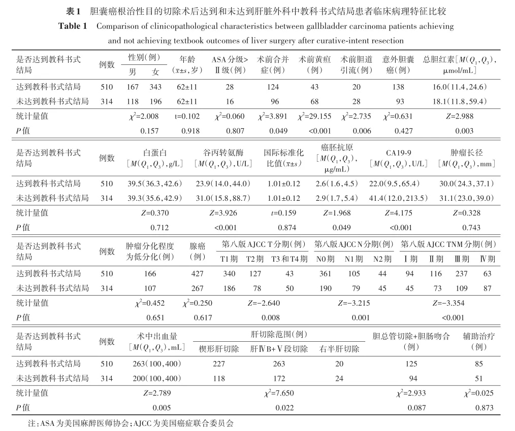 胆囊癌是胆道系统中最常见的恶性肿瘤[1-2]。根治性目的切除术是唯一潜在能够治愈胆囊癌的治疗方式,但围手术期风险较高[3]。既往评价围手术期结局通常采用单一指标[4]。2023年中华消化外科菁英荟胆道外科学组(以下简称菁英荟胆道外科学组)采用肝脏外科中教科书式结局(textbook outcomes in liver surgery,TOLS)评价胆囊癌根治性目的切除术后的围手术期结局,其特点在于手术必须完全实现一系列既定的积极短期结局才能被认定为达到TOLS[5]。达到TOLS即实现了围手术期理想结局,但临床上更加关注肿瘤患者的术后总生存时间[6]。目前尚不明确TOLS与总生存的关系。本研究回顾性分析2014年1月至2021年1月菁英荟胆道外科学组全国多中心数据库15家医学中心收治的824例(西安交通大学第一附属医院271例、陆军军医大学第一附属医院236例、中国科学技术大学附属第一医院30例、中山大学第一附属医院29例、贵州医科大学附属医院28例、浙江大学附属第二医院27例、空军军医大学第一附属医院26例、首都医科大学附属北京友谊医院25例、安徽医科大学第一附属医院25例、郑州大学附属肿瘤医院24例、重庆医科大学附属第二医院22例、湖南省人民医院21例、福建医科大学孟超肝胆医院21例、兰州大学第一医院20例、九江市第一人民医院19例)胆囊癌患者的临床病理资料,探讨胆囊癌根治性目的切除术后达到TOLS对远期预后的影响。