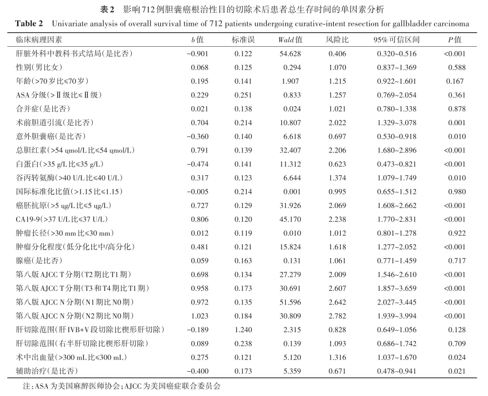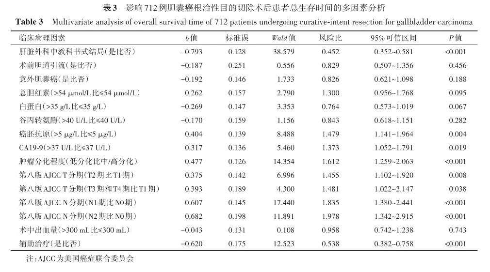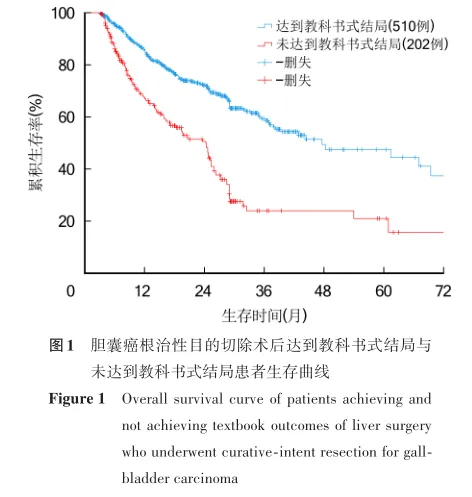 824例行胆囊癌根治性目的切除术患者,排除出院后90 d内死亡的112例,712例患者纳入生存分析。712例患者中位随访时间为19.1(9.3,29.0)个月,中位总生存时间为35.0(29.0,41.0)个月。进一步分析,510例达到TOLS患者的中位随访时间为22.1(11.4,30.1)个月,中位总生存时间为47.6(30.6,64.6)个月,5年总生存率为47.5%。202例未达到TOLS患者的中位随访时间为14.0(6.8,25.5)个月,中位总生存时间为24.3(20.0,28.6)个月,5年总生存率为21.0%。两者总生存情况比较,差异有统计学意义(χ²=58.491,P<0.001)。见图1。单因素分析结果显示:TOLS、术前胆道引流、意外胆囊癌、TBil、Alb、ALT、CEA、CA19‑9、肿瘤分化程度、第八版AJCC T分期、第八版AJCC N分期、术中出血量、辅助治疗是胆囊癌根治性目的切除术后患者总生存时间的影响因素(P<0.05);性别、年龄、ASA分级>Ⅱ级、合并症、国际标准化比值、肿瘤长径、腺癌、肝切除范围为肝ⅣB+V段切除和右半肝切除不是胆囊癌根治性目的切除术后患者总生存时间的影响因素(P>0.05)。见表2。多因素分析结果显示:TOLS、CEA、CA19‑9、肿瘤分化程度为低分化、第八版AJCC T2期、第八版AJCC T3期和T4期、第八版AJCC N1期、第八版AJCC N2期、辅助治疗是胆囊癌根治性目的切除术后患者总生存时间的独立影响因素(P<0.05);术前胆道引流、意外胆囊癌、TBil、Alb、ALT、术中出血量不是胆囊癌根治性目的切除术后患者总生存时间的独立影响因素(P>0.05)。见表3。胆囊癌根治性目的切除术通常包括胆囊切除术、肝部分切除术和淋巴结清扫术,是唯一可能治愈胆囊癌的方式,但围手术期风险较大[19‑21]。传统评估手术疗效依赖单一结果,无法全面反映风险。理想的手术结局应全面满意,医院应提供全面医疗流程。2013年提出的教科书式结局能更全面反映围手术期全貌,已广泛应用于多种消化系统疾病[22‑27]。欧洲‑非洲肝胆胰协会和国际肝胆胰协会通过德尔菲调查确立TOLS定义,明确肝脏外科手术评估的国际标准[12,28]。然而,对于肿瘤患者而言,除了围手术期风险外,同样关注远期生存。本研究中生存分析结果显示:达到TOLS患者的5年总生存率高于未达到TOLS患者。多因素分析结果显示:达到TOLS是胆囊癌患者根治性目的切除术后总生存时间的独立保护因素(P<0.001)。这提示达到TOLS不仅代表胆囊癌患者实现围手术期最理想的结局,还可实现更好的远期生存。笔者团队认为:TOLS的参数中,对于总生存时间影响最大的可能是切缘状态。既往研究结果显示:在胆囊癌根治性目的切除术中,实现阴性切缘(R0切除)患者的远期生存明显优于未实现阴性切缘(R1切除)患者[29]。切缘残留肿瘤细胞,术后肿瘤极容易进展,从而严重影响患者生存情况。其次,达到TOLS则代表患者术后90d内机体状态良好,已从手术打击中快速康复。此类患者能够更早接受辅助治疗,这有助于尽早控制肿瘤在细胞学水平“微转移”。笔者团队既往研究结果显示:辅助治疗对于延长胆囊癌患者根治性目的切除术后的总生存时间具有明显作用。此外,未达到TOLS患者,其营养、炎症状态可能都存在不同程度异常,这可能是影响患者总生存时间的因素[30‑31]。笔者团队认为:达到TOLS患者获得更长总生存时间的原因是多种因素协同所致。本研究结果显示:TBil、CEA、CA19‑9、肿瘤分化、第八版AJCC T分期、第八版AJCC N分期、辅助治疗是影响胆囊癌根治性目的切除术后患者总生存时间的独立影响因素。目前,国际上有3项前瞻性RCT探索辅助化疗对胆道恶性肿瘤远期生存的影响,即BILCAP研究(卡培他滨比空白对照)、JCOG1202研究(替吉奥比空白对照)和STAMP研究(吉西他滨比卡培他滨)[32‑34]。其中,BILCAP研究虽然在意向治疗的分析人群中未实现主要研究终点,但在符合治疗方案的分析人群中,发现了卡培他滨能够提高患者生存率。2024年美国临床肿瘤学会年会,更新了JCOG1202的5年随访结果,证实替吉奥在患者总生存和无复发生存均明显获益(摘要号为4119)。上述研究结果均提示化疗在胆囊癌辅助治疗中使患者获得肿瘤学收益。最近,TOPAZ‑1与KEYNOTE966研究证实在不可切除的胆道恶性肿瘤中,免疫治疗联合化疗能够明显提高患者的总生存率,提示免疫治疗在胆道恶性肿瘤中的应用潜力[35‑36]。然而,目前缺乏免疫治疗在胆道恶性肿瘤辅助治疗应用的循证医学证据[37]。2023年10月,Clinical Trail官网登记了1项Rilvegostomig联合化疗用于胆道恶性肿瘤术后辅助治疗的RCT,预计纳入750例患者,随机接受Rilvegostomig与安慰剂治疗(NCT06109779)。此项研究有望弥补免疫治疗在胆道恶性肿瘤辅助治疗的研究空白。本研究虽存在选择偏倚和辅助化疗信息不完整等局限性,但15家医学中心覆盖全国地区,所得结果接近真实世界情况。综上,达到TOLS的胆囊癌根治性目的切除术患者能够获得更好的远期生存。作者贡献声明 刘智鹏、戴海粟、张东、陈志宇:酝酿和设计实验;刘智鹏、李子沐、赵小林:实施研究;刘智鹏、罗宇乐:统计分析和解释数据;刘智鹏、李子沐:起草文章;白洁、江艳、李云峰、喻超、黄帆、吴兆平、周进学、尹大龙、丁睿、郭伟、朱沂、陈伟、林科灿、岳平、程遥、张东:采集数据和分析;戴海粟、张东、陈志宇:对文章的知识性内容作批评性审阅;李云峰、喻超、黄帆、吴兆平、周进学、尹大龙、丁睿、郭伟、朱沂、陈伟、林科灿、岳平、程遥、张东:课题设计指导;江艳:行政,技术或材料支持;