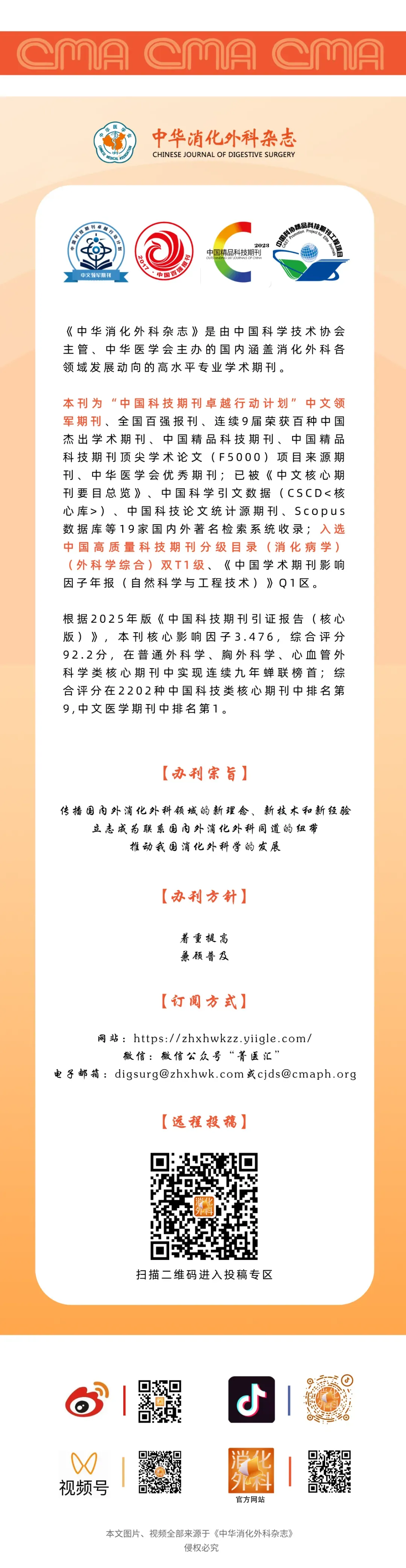 刘智鹏,李子沐,罗宇乐,等.胆囊癌根治性目的切除术达到教科书式结局对远期预后影响的全国多中心队列研究[J].中华消化外科杂志,2024,23(7):926-933. DOI:10.3760/cma.j.cn115610-2024 0527-00264.● 本文发表在《中华消化外科杂志》2024年第23卷第7期,欢迎点击文末“阅读原文”下载、引用