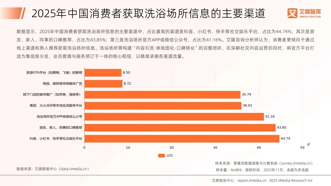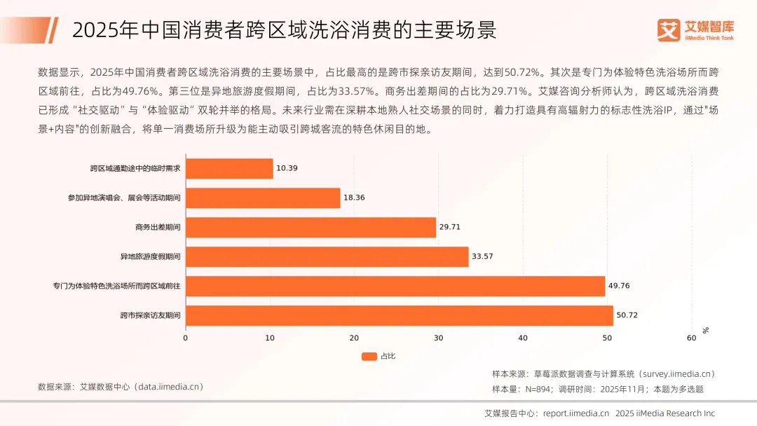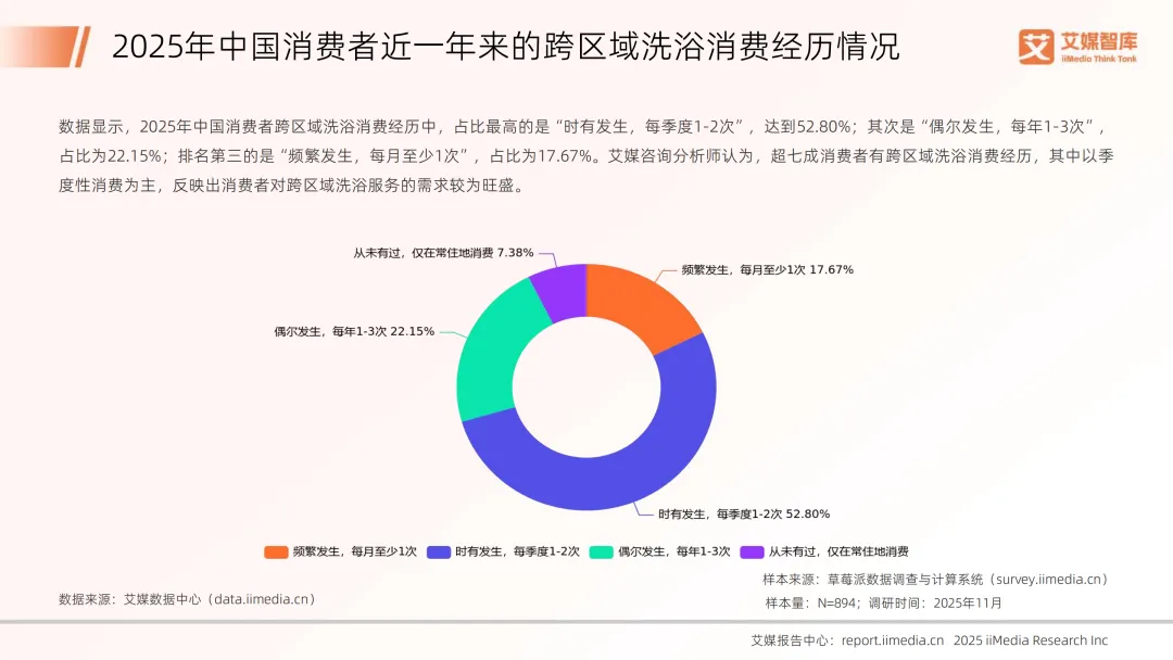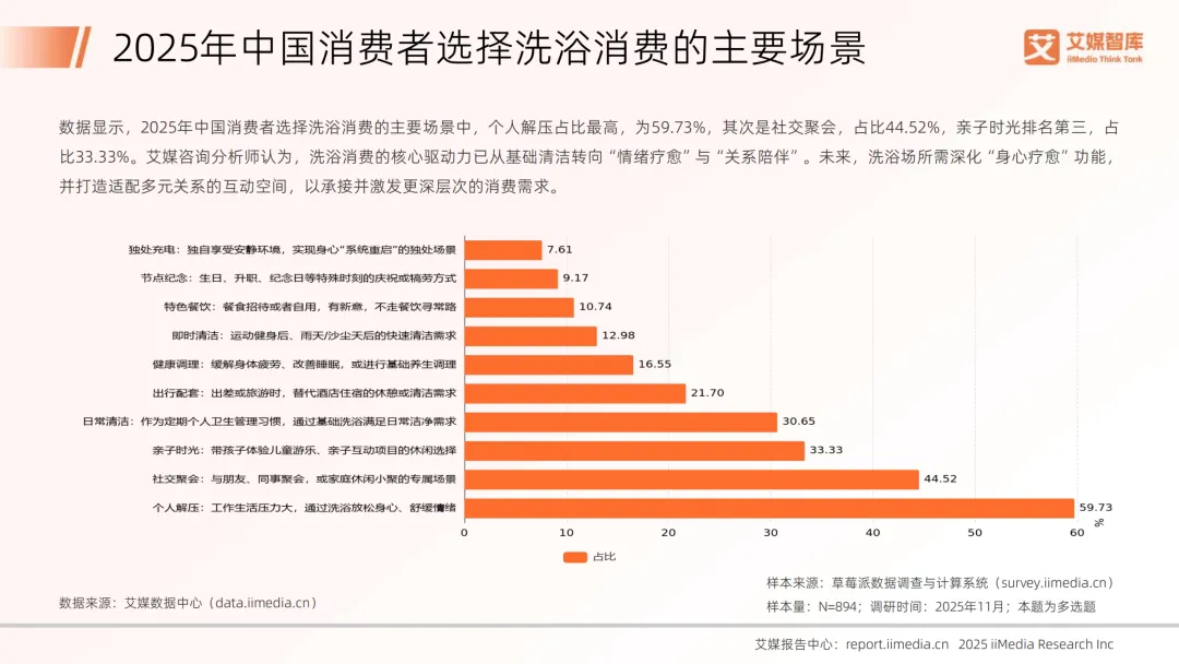 2025年中国洗浴服务消费市场渗透率已达86.35%,整体呈现高普及态势。核心客群聚焦二线城市26至40岁的都市职场人群,消费时段集中在周末晚间,以个人解压与社交为主要动机。市场偏好综合型洗浴中心与500至2000平方米的中型门店,搓澡、桑拿汗蒸是基础必选服务,洗浴叠加自助餐、住宿的融合业态需求高涨。消费者决策优先考量交通、价格与卫生安全,行业现存隐形消费、卫生不达标、同质化等痛点,多数消费者支持品牌连锁化,行业正朝着情绪疗愈、一站式微度假、数字化与标准化的方向升级。