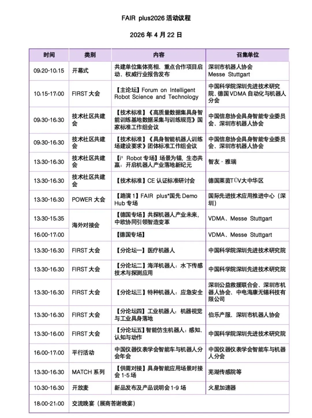 2026年4月22日-24日,FAIR plus机器人全产业链接会将在深圳会展中心(福田)隆重启幕。FAIR plus2026定位于“世界级机器人开发制造技术大会”,是一个专注于机器人全产业链技术和开发资源的平台。通过学术会议、技术标准、社区培育、供需对接等方式,创造人工智能+机器人各产业链环节的开发、产品、工程、方案等技术人员,以及有意引入机器人的场景方相关工艺、设备、信息技术人员线下见面的机会,达成合作,以有效促进机器人向智能化方向发展,连同提升产业整体能力的建设和配置。