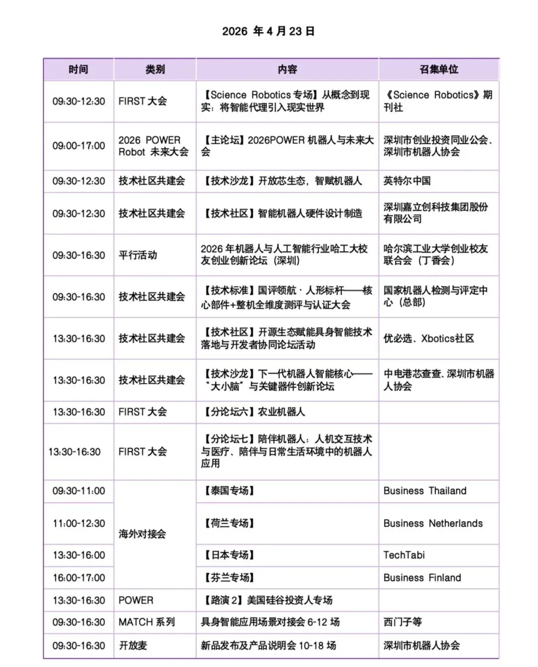 联合深圳市创业投资同业公会等单位联合举办,机器人产融创新与赋能峰会POWER大会,追求前沿引领(Pioneer)、最有配置(Optimal)、行业智慧(Wisdom)、资本赋能(Empower)、机器人垂域)Robotics),邀请行业领袖、投资精英围绕技术突破、应用落地、资本赋能、国际布局等话题深度对话,研判趋势,把握行业机遇。同期,举办POWER路演3场。